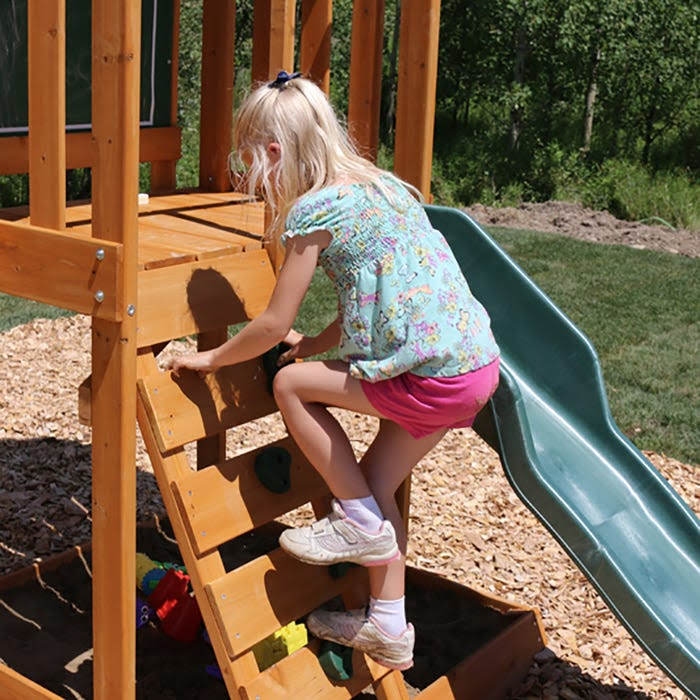 The multi-level Ainsley Climbing Frame Set can do something for smaller back yards that swing sets alone can’t—entertain up to six active kids at once. That’s because Ainsley packs in loads of fun features like a high-rail wave slide, a multi-colored rock wall for climbing and a shaded upper-level clubhouse with chalkboard tarp. Underneath, little diggers can play to their hearts’ content in the spacious sandbox. And of course, the sturdy swing set invites youngsters to reach for the sky in the two bright yellow belt swings. Ainsley is constructed of high-quality premium cedar lumber with a pre-applied child-friendly stain. It also comes pre-cut and pre-drilled for easier assembly. For maxi-fun in a mini-space, the Ainsley Climbing Frame is the perfect choice.